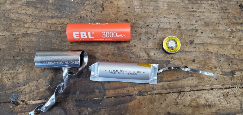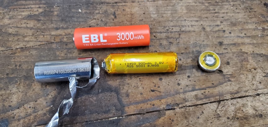 As you can see this is actually a 13450 cell rated at 3.8v 900mAh which from my rough calculations seems to coincide with the 3000mWh on outer wrapping once the voltage is stepped down to 1.5v. Just remember this is one of my older batteries and the newer ones may be different.