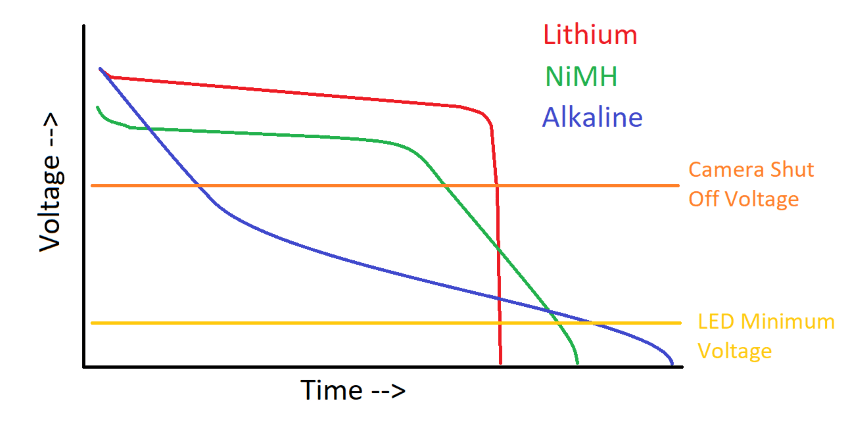 As you can see in the graph there’s what’s called a usable voltage limit. In this case, it would be the shut-off voltage of my camera which is a high draw device and requires a minimum of about 1.1v per battery to operate indicated by the orange line. This is also sometimes where the batteries can be depleted to and recharged without damage to the chemistry. As you can see the lithium batteries have the most amount of time above the line until it hits the minimum voltage of the chemistry and cuts voltage to protect the cell. This is great because in high draw applications like a camera this is what you want a long-lasting battery before the camera reaches the minimum voltage limit. Now we look at NiMH batteries you can see that it also lasts longer than standard alkaline batteries but as you can see with their lower starting voltage it hits that minimum voltage limit faster than lithium does. And of course, alkaline tapers steadily down to the minimum voltage limit for the camera.