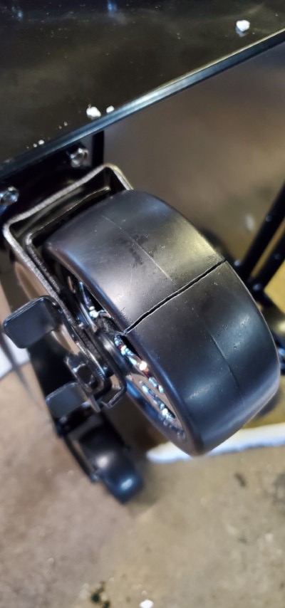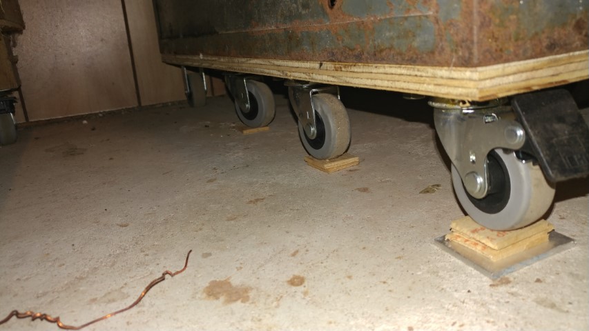 Also added some wheels to it to make it mobile if I ever need to move it. To be within the caster’s rated capacity I had to use 8 of them. You’ll see I had to shim the wheels due to the floor slope.