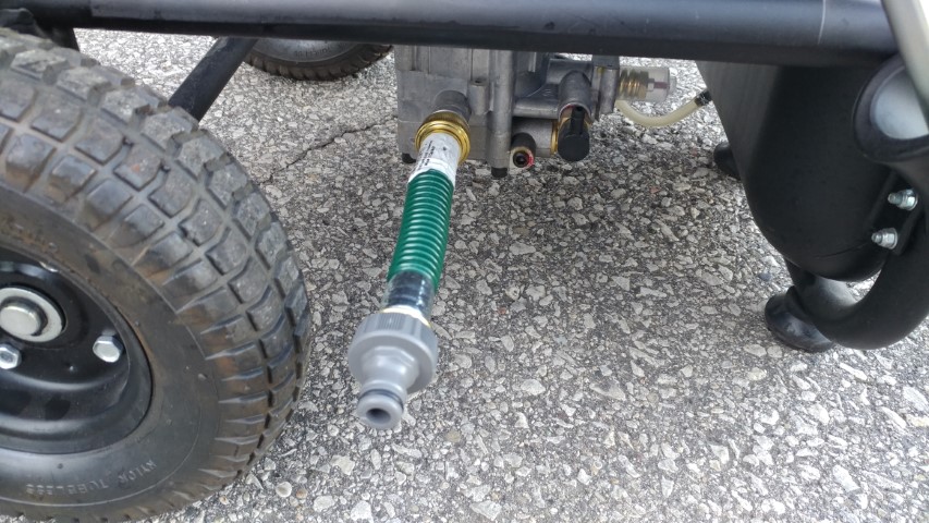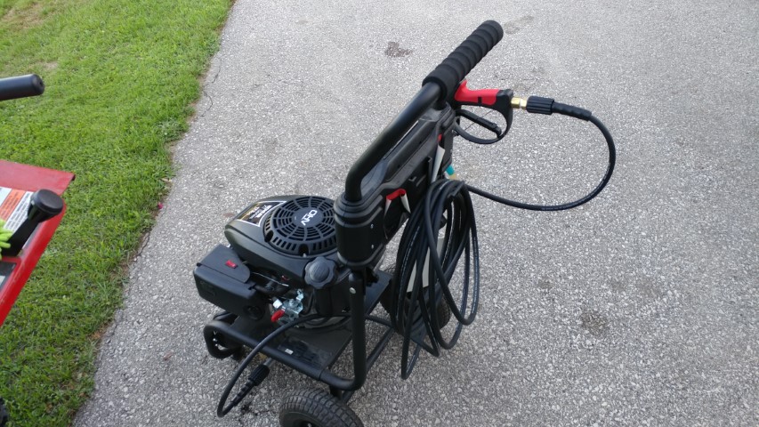 So I picked up a gas pressure washer from work. It was an old display model and being a display model all the accessories were either stolen or just plain lost. I agreed to purchase the pressure washer minus the cost of the missing accessories. So I nabbed myself a 2600psi Simonize pressure washer for $60+tax, not a bad deal. Naturally, I didn’t buy the accessories at work ‘cus they are way overpriced. I also replaced the line in on the thing because the stiff plastic is known to snap when being hit during normal transportation.
