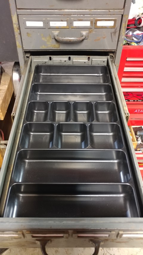 So I have this old filing cabinet that I will be using to store things such as small engine parts, nuts and bolts, tapes and glues, etc.