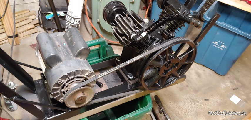 So after getting a coat of paint onto my bracket I started mounting the motor and pump. One little trick I like to use is taking a trigger clamp and using it in the spreader configuration to tension the belt properly.