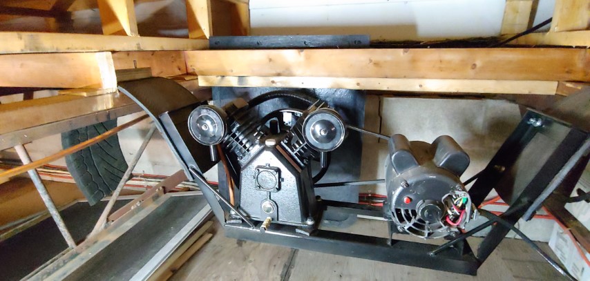 After getting the tank up into place I then had to mount the compressor/pump assembly. I plan to also suspend it from the trusses in the garage similarly to how I have the tank mounted. However, I plan on using some tire tread to suspend it. I figure it will give some vibration isolation and it has steel ply in the rubber to help with strength. I had originally planned on hanging it with heavy-duty springs but decided against it because the stability of the unit was extremely lacking. I built some brackets out of some angle iron and welded grippers onto them so that they have some bite into the rubber. I also put up some heavy-duty truck mud flaps to help isolate some noise since where I am putting it is the wall up against the house. I also finalized the mounting of the tank.