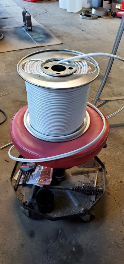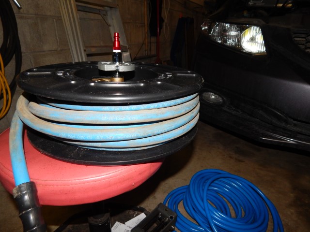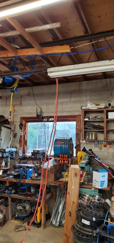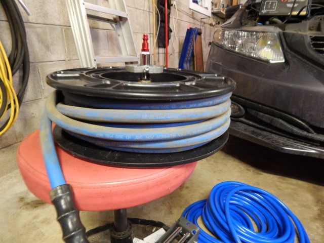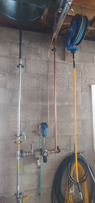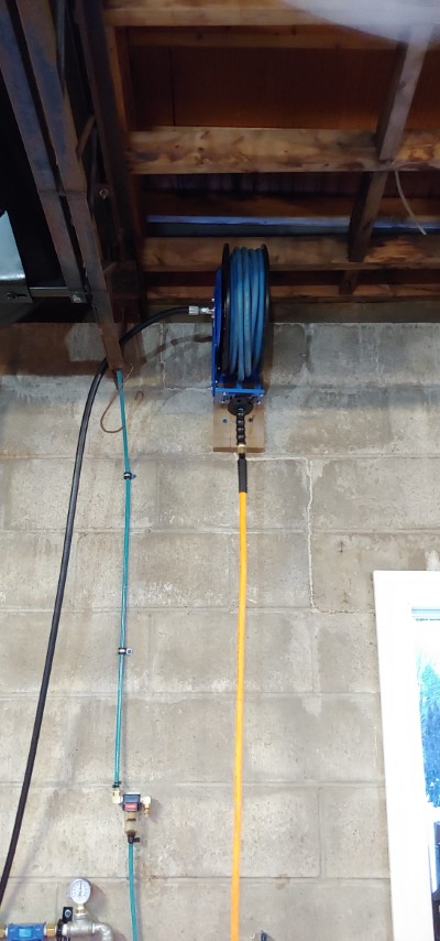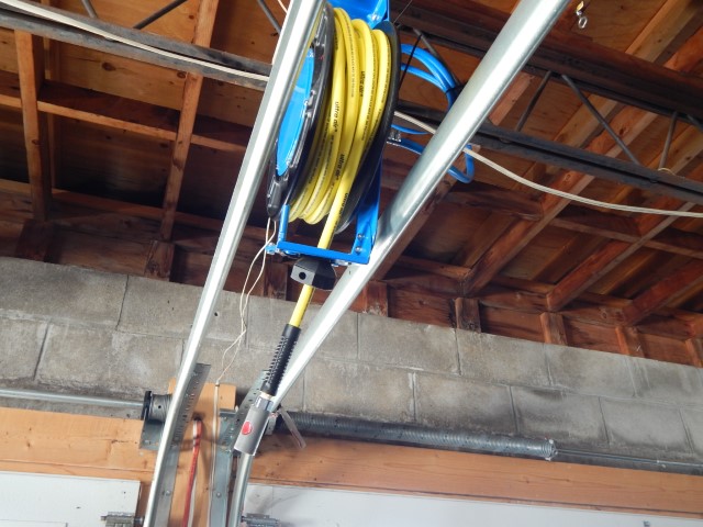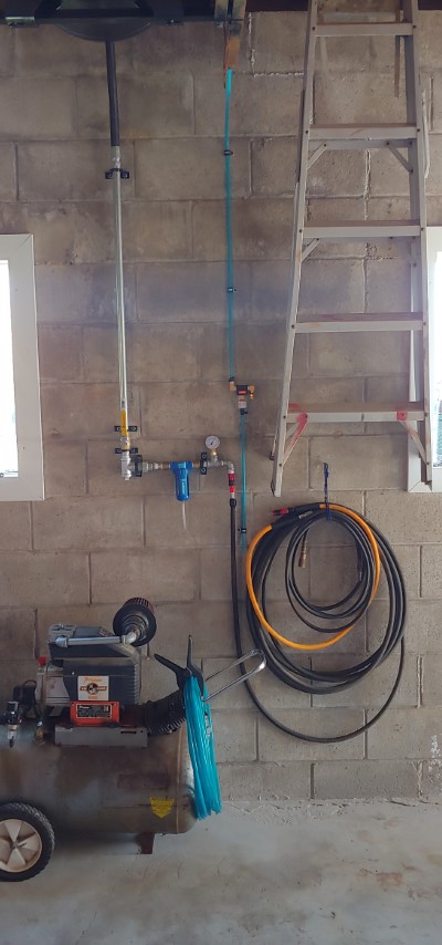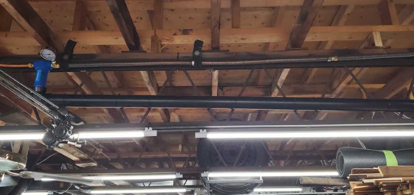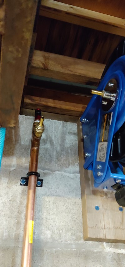 Yea that would make a great spot for tires. After looking some more the entire row between these 2 steel trusses would actually be perfect for all the tires we have for the 3 vehicles. First, step is to relocate the air line going to the front hose reel and while I’m at it I might as well “properly” plumb the air line to the hose reel at the rear of the garage.