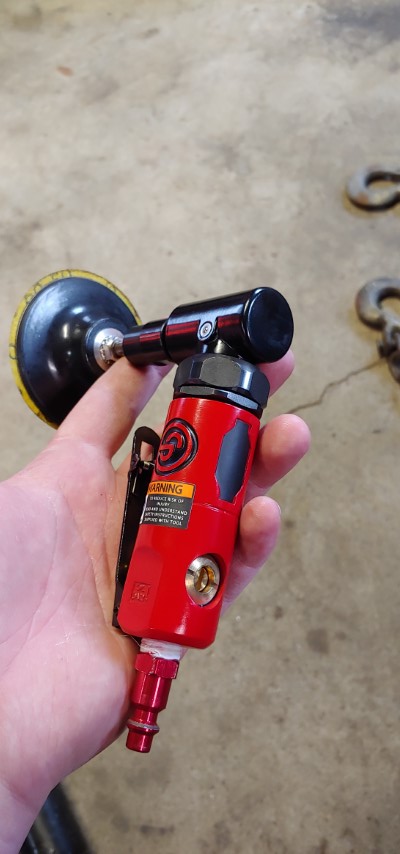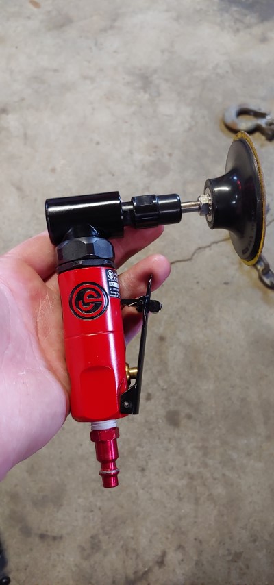 It’s been a little bit since I got my compressor up and running and I have started shopping around for air tools. First one I’m investing in is a 90 degree die grinder. I’ve been wanting one of these for quite a while now so I purchased one through work made by Chicago Pneumatic. I also got a larger 3″ twist lock adapter for sanding discs since my uncle has recently purchased a new trailer and wants me to clean up some of the rust on it.