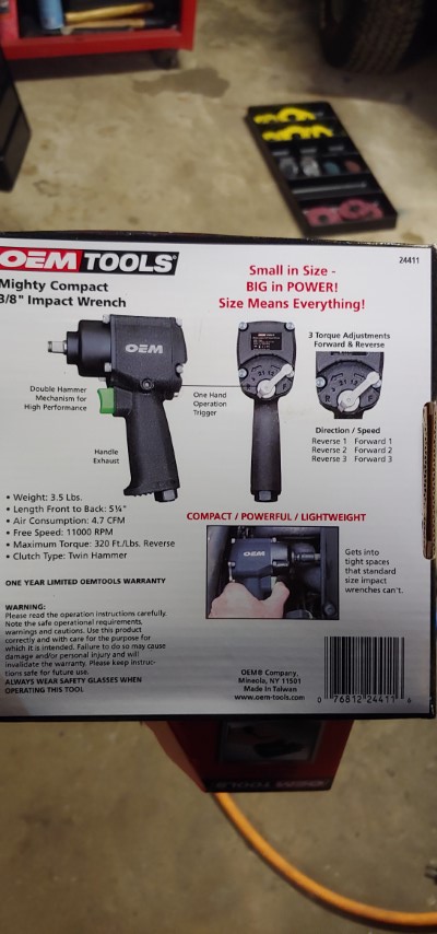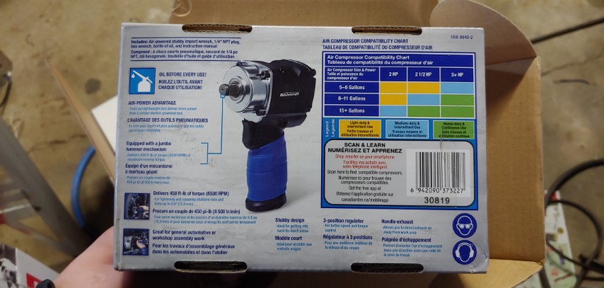 More tools! My old impact gun is really starting to get long in the tooth. It served me well but with several years of use in a garage at 150psi when it’s rated for 90psi I don’t blame it for being tired. Enter my new impact. It’s a stubby impact which some people don’t like. With this impact I’m not overly worried about longevity since I’m not working in a shop anymore. Also it has plenty of power for what I need since I don’t need to worry about over torqued wheel nuts anymore.