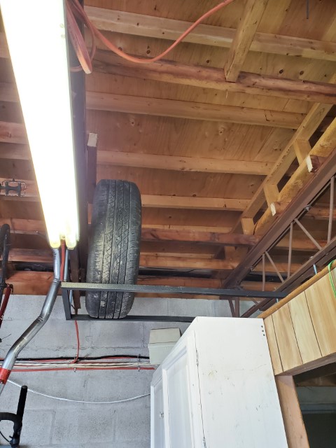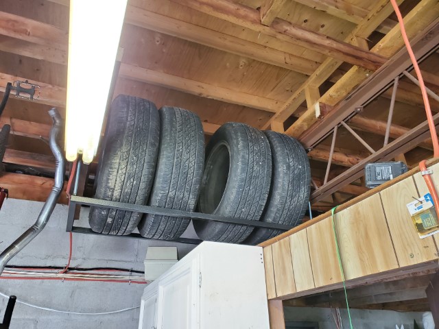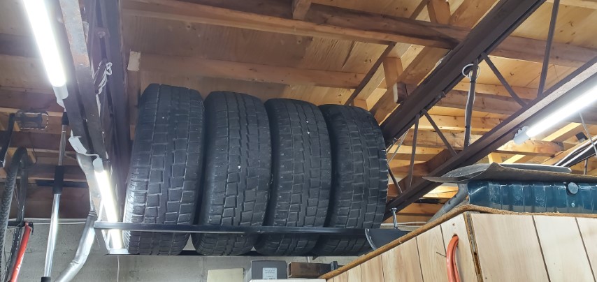 Ok, here it is time to start that project I’ve been talking about. Let’s start with a little bit of background. So, it’s tire season and well I have all our tires stacked nice and neatly on tire dollies which makes it very easy to move them around but do nothing to save floor space. Then while I was putting on some winter tires I looked up at the space pictured below and thought, “Wow that would be a great spot to store some of these tires.”