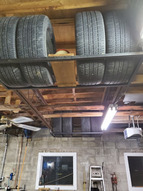 That is pretty much it for this project, so enjoy some pictures of the racks with the tires on them. I gotta say it saves a ton of room on the floor and makes some usable space out of previously unusable space.