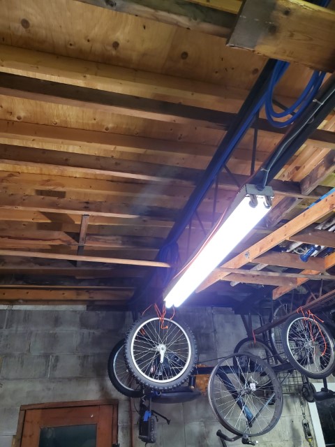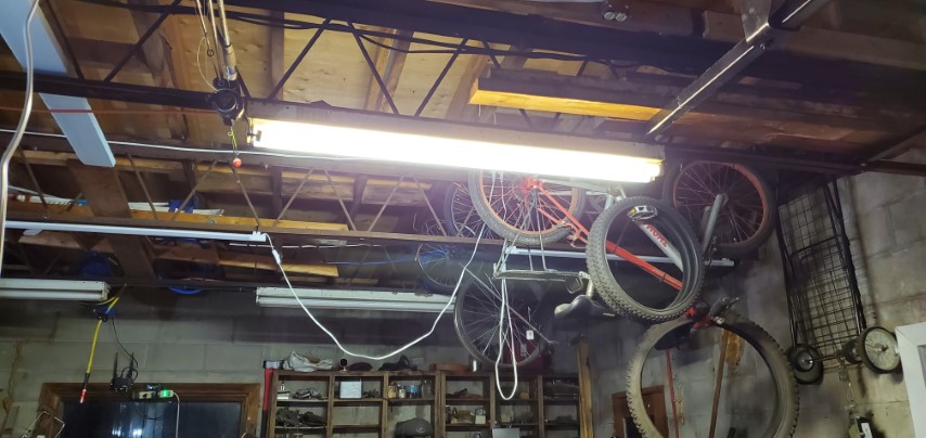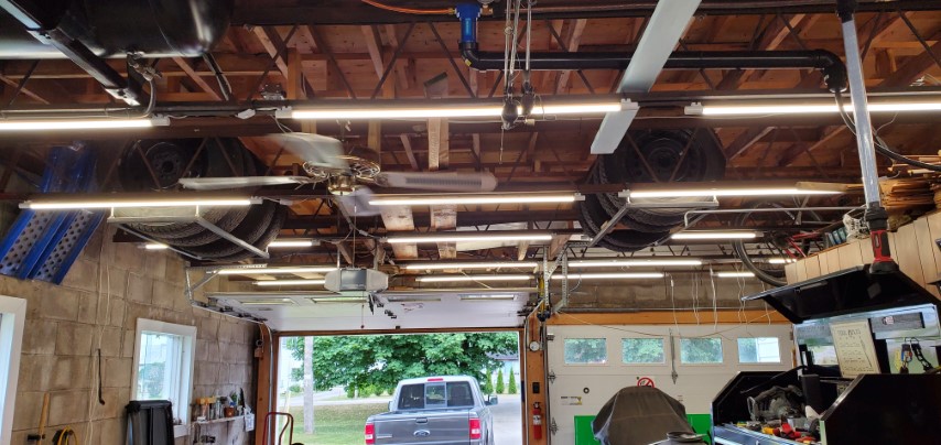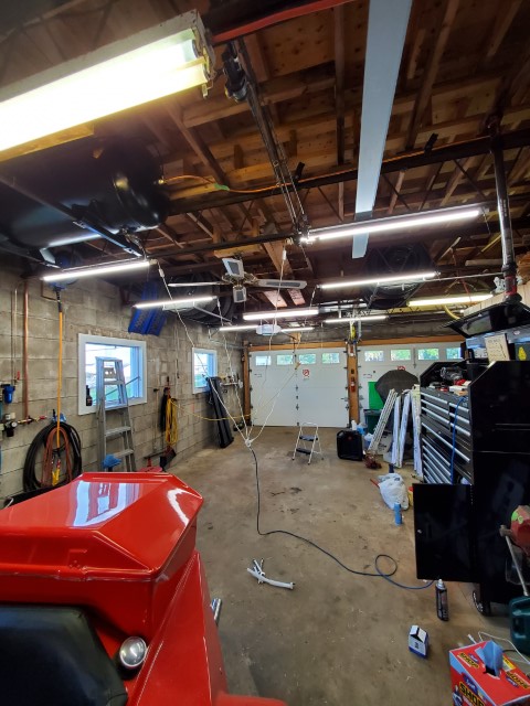 One thing that every garage needs is good lighting. I can’t say it enough, “If you can’t see what you’re working on, you can’t fix it”. Honestly, my current lighting situation isn’t great. I currently have 6 fixtures(one in the enclosed room) in the garage with 2x T8 bulbs each. At about 2300 lumens per bulb that’s 27600 lumens for the entire garage and with the size of the garage being approximately 36′ long by 21.5′ wide giving me 774 sq. ft. I have 35.66 lumens per sq. ft. So it’s dim, they have a hard time turning on in the cold, take a while to get to full brightness, the switches are all over the garage and I can’t forget to mention at 40 watts per fluorescent tube my current setup uses 480 watts. That’s kinda crappy.