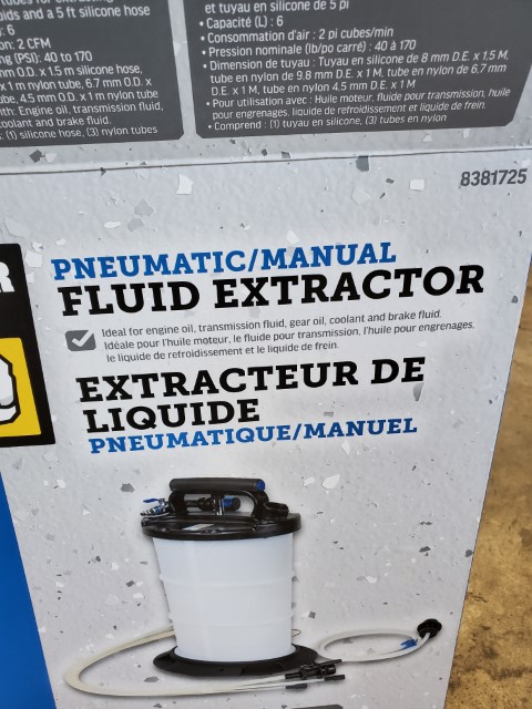 Well, yeah I bought a fluid extractor. This one is nice since it is both manual and pneumatic which will come in handy. I was tempted to purchase one through work which are more professional oriented. While the ones I can get at work have more fluid capacity they are either manual or pneumatic only and expensive. I don’t exactly want to keep 2 different extractors just in case I need one over thee other. So when I saw this Princess Auto special I jumped at it.
