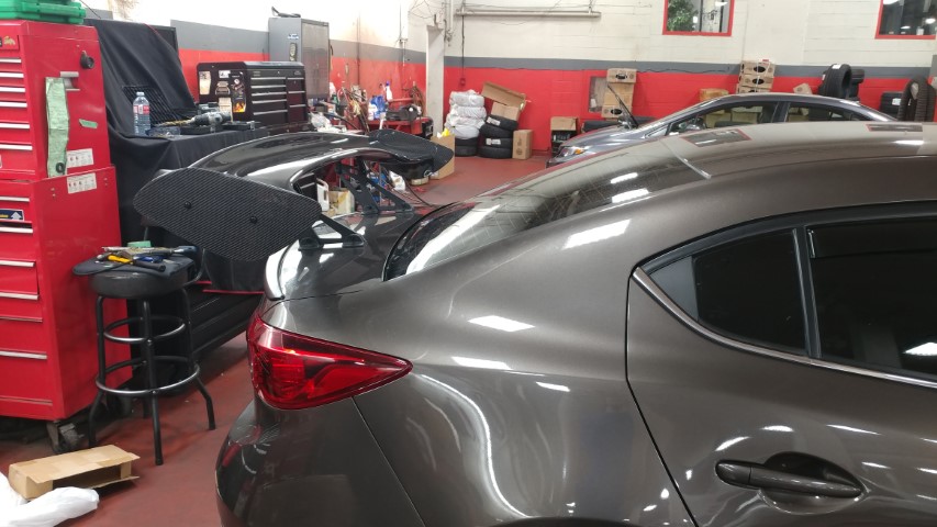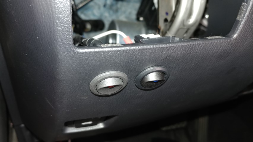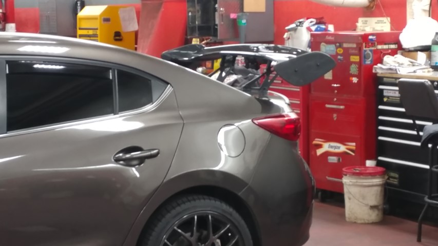 While we were at it my co-worker has had a non functioning trunk light for quite a few months now due to a damaged control unit which he said Mazda wanted something around the $200 for just the part. Since we had power to the trunk now I decided to tackle it and see if I could get something working before the shop closed. He purchased some high intensity LEDs like the ones I installed in my Civic and a switch. He was perfectly fine using a simple toggle switch mounted somewhere that he could turn on and off. I wasn’t quite satisfied by that and I would personally find it a little annoying to toggle it on and off every time you opened the trunk. So I put my mind to work to try and figure out a solution to this problem. I wanted something simple and since the control unit for the OEM light was already damaged I didn’t want to tie into the OEM system at all and risk damaging more things, so I fixed it with a horn button. . . Yes it seemed my solution was a $10 horn button we sell at our shop. I bought the button and promptly mounted it where the regular rubber bumper stop would go on the driver side. I had to cut the backside of the button as it was a bit too tall but I still ended up shimming the passenger side bumper a little so not too much pressure was on the button. All in all i think it works pretty good, we’ll just have to see how long it lasts.