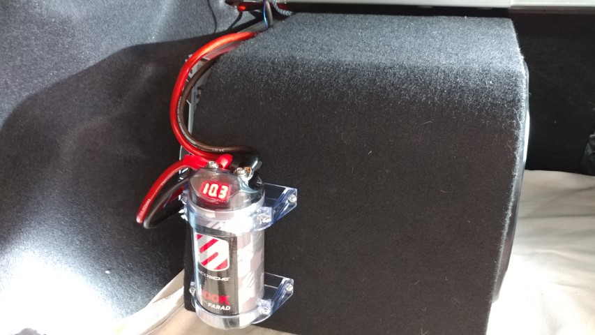 After getting all the wiring I need to the back i can start working on the Amp/Sub box itself. The wiring kit itself came with a Scosche 500K Micro-Ferad capacitor. I know many people have mixed feeling about capacitors some say they’re a must some say they’re useless etc etc. I personally think capacitors should be used more as a power delivery filter rather than a device to prevent headlight dimming. At any rate this capacitor will more or less be for aesthetics rather than pure function.