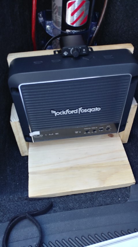 So on the weekend I ended up finally getting around to making my new amp bracket. Not sure if I mentioned before but I had 1x 8″ Pioneer slim sub under the driver’s seat powered by a Pioneer amp. The setup was ok but I wasn’t quite happy with the performance. It definitely added much needed bass but the amp I had lacked some basic features because it was one of Pioneer’s older and cheaper amps so things like bass control weren’t there. I now have 2x 8″ Pioneer slim subs under each front seat powered by a Rockford Fosgate amp. I got it all set up properly using a multimeter and scope at work to make sure the overpowering amp was set right and that there was no clipping. I think the 2 subs give the interior cabin just the right amount of tight punchy bass and since they’re under the seats I don’t need to vibrate my panels off to feel the bass also. I’m also considering making more in progress shots almost like a DIY guide style or some youtube videos not sure yet though. Anyways below is the temp wooden bracket I was using while setting up the amp wiring and settings and the new metal bracket.