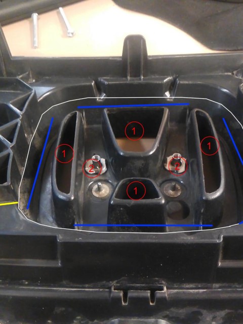 1. Obviously with the grill off the car carefully cut out the areas indicated with a 1 in the picture using a rotary tool and fine point grinding inserts.
